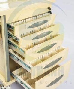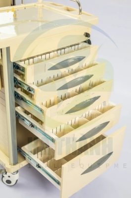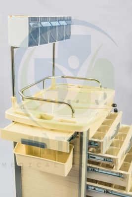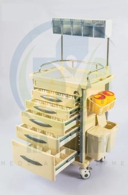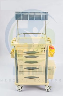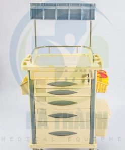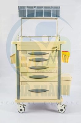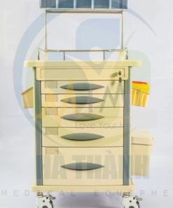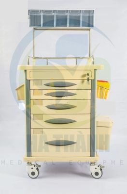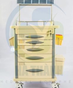 | Xe đẩy gây mê Kích thước: 750*475*930mm 1) Tấm nóc đúc nhựa ABS 2) Bên trên có 1 hàng hộp chứa 3) Có 5 ngăn kéo có khóa trung tâm gồm: 2 ngăn kéo nhỏ, 2 ngăn kéo trung và 1 ngăn kéo lớn (bên trong các ngăn kéo có bộ chia ô giúp chia mỗi ngăn kéo ra thành nhiều ô nhỏ nhiều kích thước khác nhau) 4) Trước mỗi hộc kéo có chỗ gắn nhãn. 5) 2 bên nóc tủ có 1 bàn trượt có thể xếp vào mở ra, có hộp chứa kim tiêm. 6) Bên phải xe có 2 hộp đựng rác. 7) Bên phải xe có hộp đựng đa năng. 8) Cột xe làm băng hợp kim nhôm. 9) Có 4 bánh xe cao cấp chống ồn (2 cái có khóa) Model: AT-75002A |